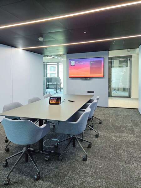 Die Räume sollten einsichtig bleiben. Es waren große und rahmenlose Glasflächen gefordert und doch wurde insbesondere auf die Akustik im Cube geachtet. Die Nachhallzeit im Raum sollte nicht länger als 0,3 Sekunden sein. Für die woodtec Konstruktion war der Wert leicht zu erreichen. Die hoch schallabsorbierende Decke und einzelne Wandabsorber stellen den Zielwert sicher, ohne den Anteil an Glasflächen einschränken zu müssen.